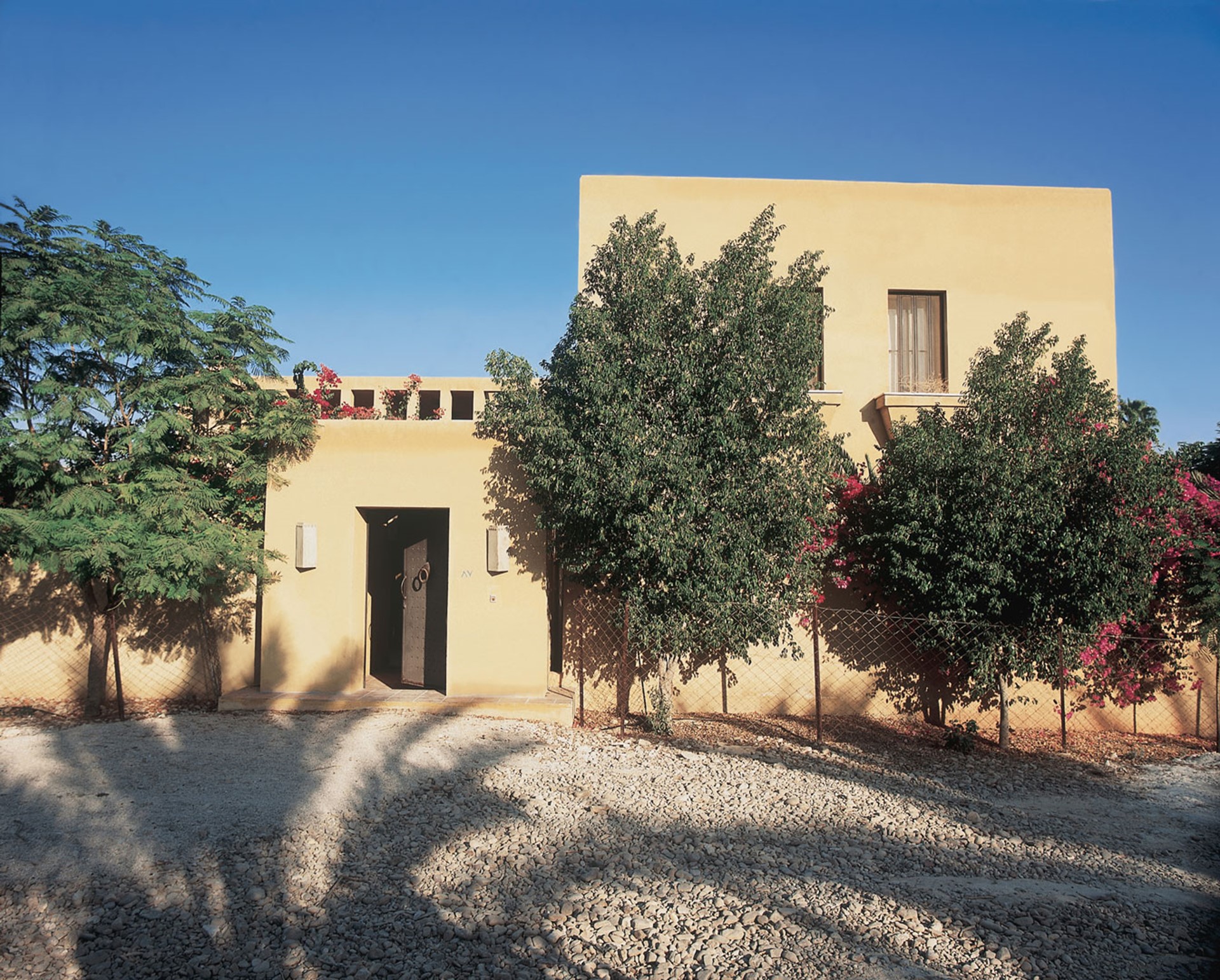 The site is located in the southern part of the Jordan Valley; an agricultural region with a hot, arid climate that provides a favourable setting for winter retreats, such as this weekend house. The land was acquired by the client, along with an existing “domino plan”, concrete structure that had to be incorporated into the new design. The main design brief requirements were to minimise construction costs, and reduce external and internal living spaces, while incorporating a traditional or vernacular character. The house is designed following an L-shaped footprint that defines a courtyard with two boundary walls. Although the reference to the courtyard house is clear, the L-shaped footprint, the massing of the building and the treatment of the courtyard as an extension of the main living space are atypical of the conventional courtyard house. The relationship between the courtyard and the main living space is characterised by visual, spatial and structural continuities that reduce the autonomy of spaces traditionally found in this typology. This relationship between internal and external spaces is further emphasised by the external roofed living room on the upper floor. The project provides a subtle transformation of space/type that allows spaces to extend and flow into one another, without transgressing the “rusticity” required by the client.