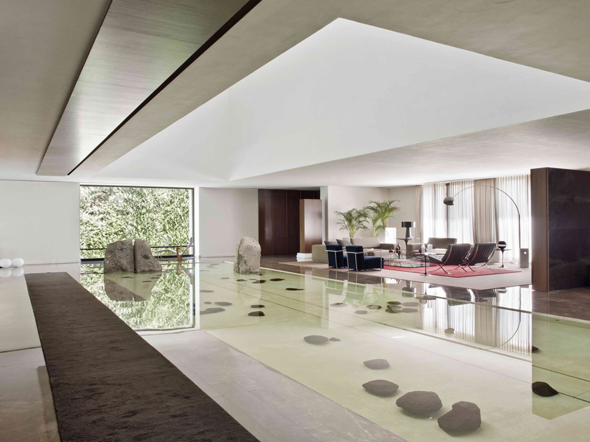 S-House is located in Abdoun, an affluent residential district in west Amman. The predominant house-type characterising the district is the over-scaled detached “villa”. The site is a flat plot of land surrounded by residential structures on three sides, and a primary access road. The site does not offer any views with which the house may establish a rapport. To compensate for this absence, the house was designed as an introverted entity that is organised around an internal landscape. The silent schematic quality of the exterior is in strong contrast to the richness of the interior. This project attempts to reinsert qualities of privacy, characteristic of the traditional “Arab” house, within a context dominated by extroverted exhibitionism. The open plan is anchored by a large internal reflecting pool and a double-height space that allows filtered light to penetrate the interior. The double-height space offers sectional variation within an otherwise horizontally expansive field.